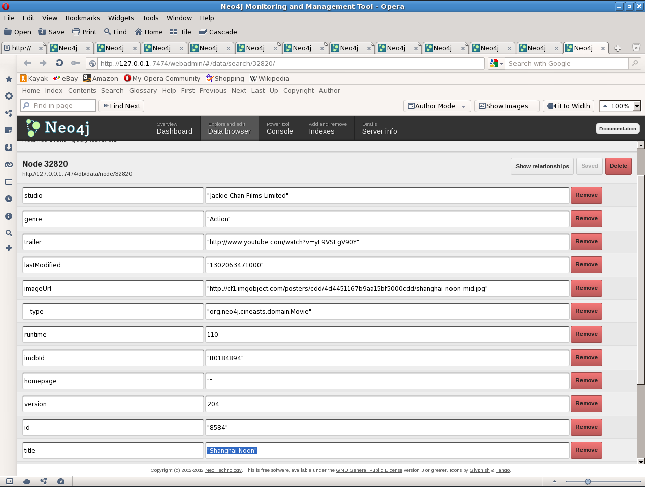 If you already have the internal Node ID, in this case 1000, you can then find lots of information on it. Enter the Node identifier in the query box and simply enter Control-Enter. It will give the same result. http://127.0.0.1:7474/webadmin/#/data/search/1000/ You can add or remove properties. Delete the whole node. Add another node. Or create a Relationship.