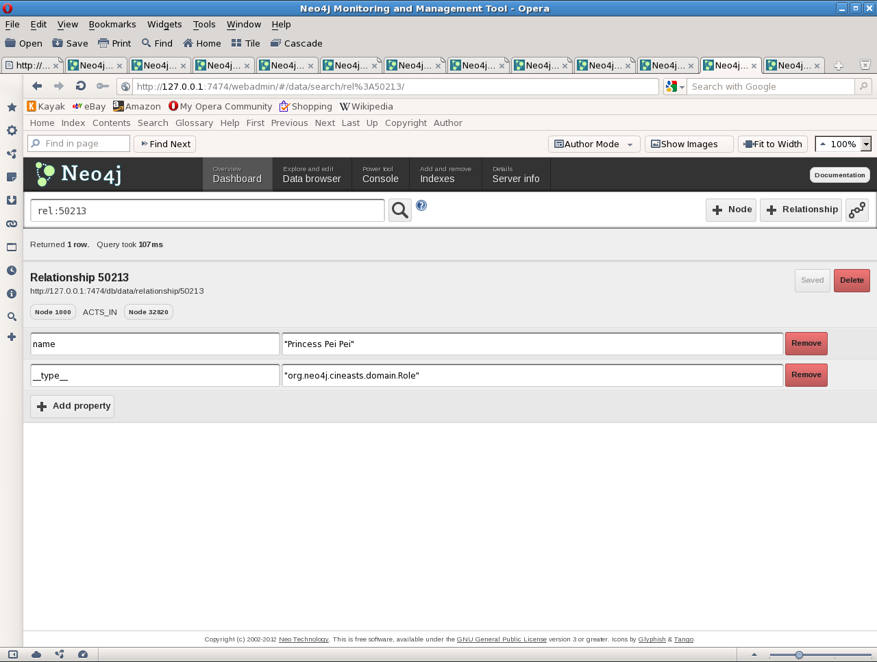 If you then click a single Relationship node, you will get detailed information on this relationship. http://127.0.0.1:7474/db/data/relationship/100019